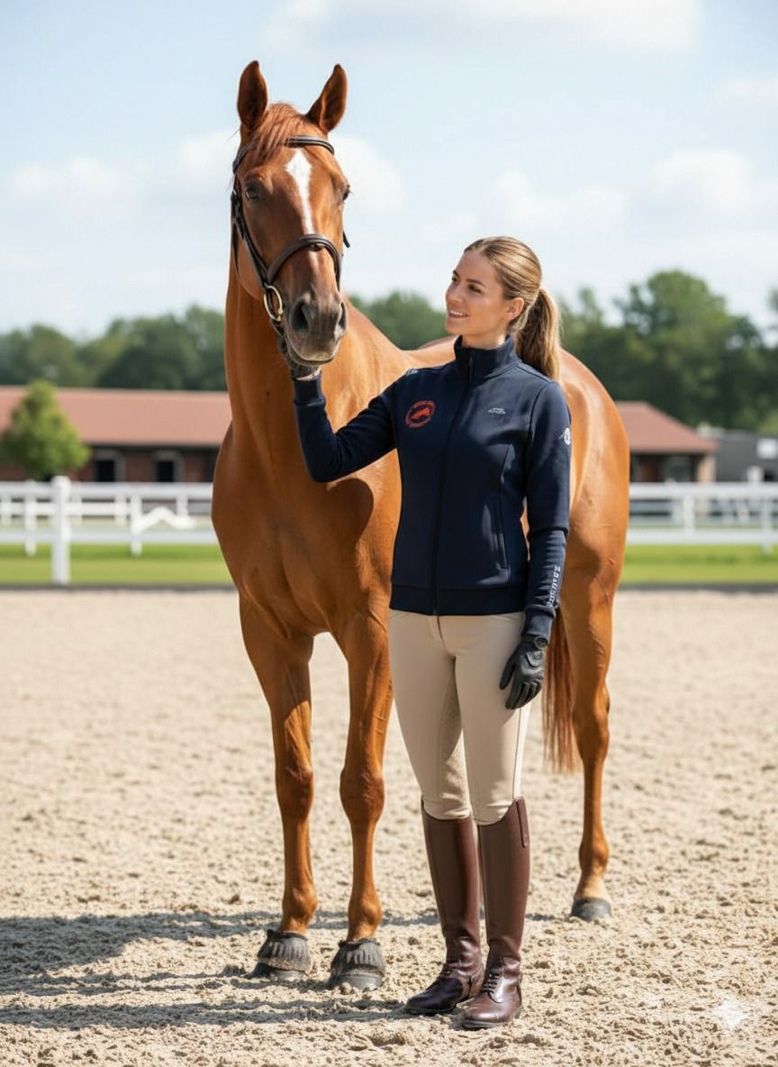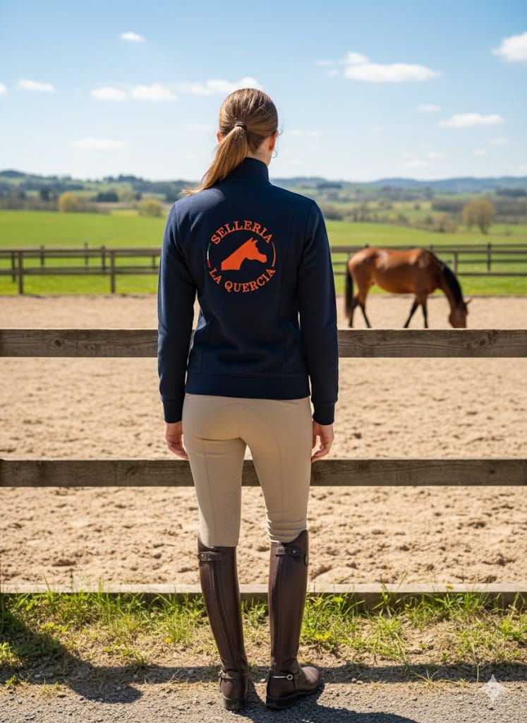 Comoda e raffinata, questa felpa full zip da donna è il capo perfetto per affrontare le giornate con stile. Dotata di doppie tasche frontali e polsini elasticizzati a costine, garantisce praticità e una vestibilità che valorizza la silhouette. Il design con zip integrale offre massima versatilità, mentre i dettagli del logo ricamato su petto e manica aggiungono un tocco di classe discreta. Perfetta per ogni occasione, dal tempo libero all´attività equestre.