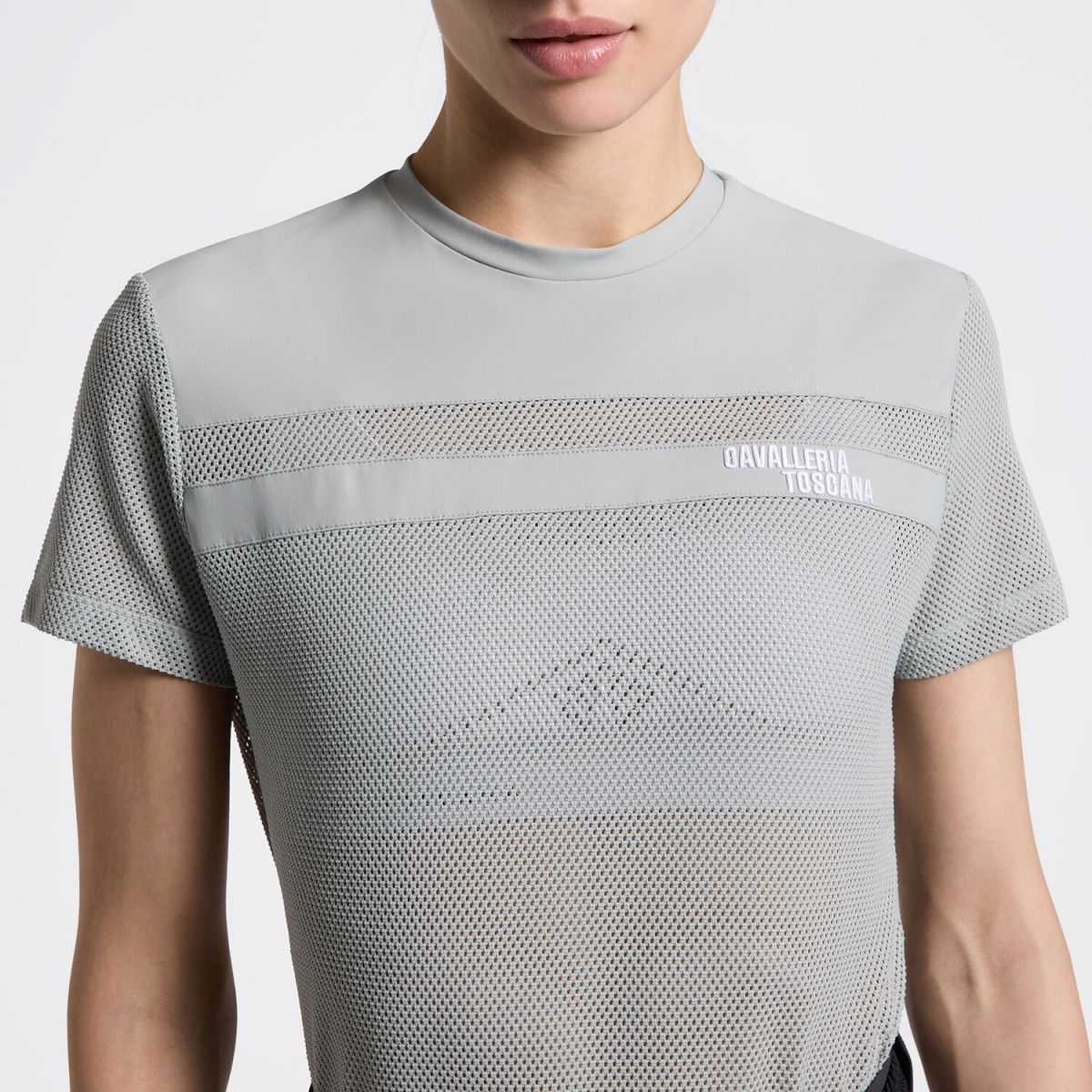Massimizza la ventilazione e il comfort durante l'attività con questa T-Shirt tecnica da donna di Cavalleria Toscana. Ideale per le giornate calde, è realizzata in un innovativo tessuto perforato, che copre il corpo e le maniche assicurando una circolazione dell'aria eccezionale. L'umidità viene dissipata rapidamente, mantenendo la pelle asciutta e fresca. Il design è moderno e dinamico, caratterizzato da un inserto orizzontale liscio sul petto, che crea un piacevole contrasto visivo con la texture traforata. Il girocollo a costina e il logo Cavalleria Toscana applicato rifiniscono il capo con un tocco sportivo. Perfetta per l'allenamento, offre la tecnicità necessaria con un look contemporaneo.