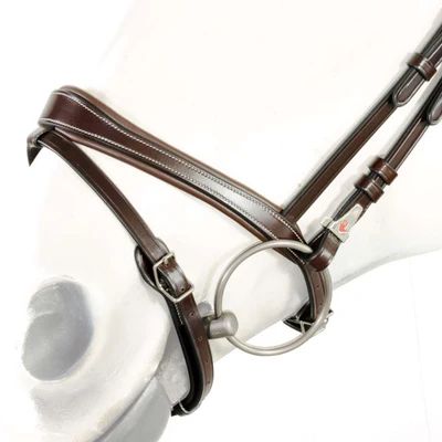 Testiera da salto con sopracapo anatomico “no stress” che rispetta la morfologia della testa del cavallo alleviando la pressione. Realizzata in cuoio naturale, è dotata di frontalino, capezzina irlandese . Disponibile con fibbie/finiture in acciaio nei colori nero e marrone. Taglia cob e full.