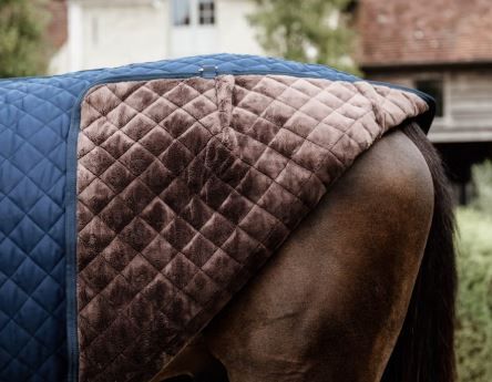 L'interno della coperta da stalla è foderato con la pelle di coniglio artificiale, caratteristica di Kentucky. Questa fodera evita lo sfregamento e lucida il pelo del cavallo. Inoltre, la pelle di coniglio artificiale crea uno strato isolante intorno al cavallo, intrappolando e mantenendo il calore corporeo del cavallo. Per un calore extra, abbiamo aggiunto un'imbottitura in fibra di fil di ferro da 400 g. Questa imbottitura ha un effetto simile al piumino, ma è più facile da usare. L'esterno della sofisticata coperta da stalla è in poliestere ad alta tenacità 600D ed è trapuntato a rombi. La trapuntatura, in combinazione con il poliestere 600D, rende la coperta incredibilmente difficile da strappare. Inoltre, i trucioli non si attaccano al tessuto.
