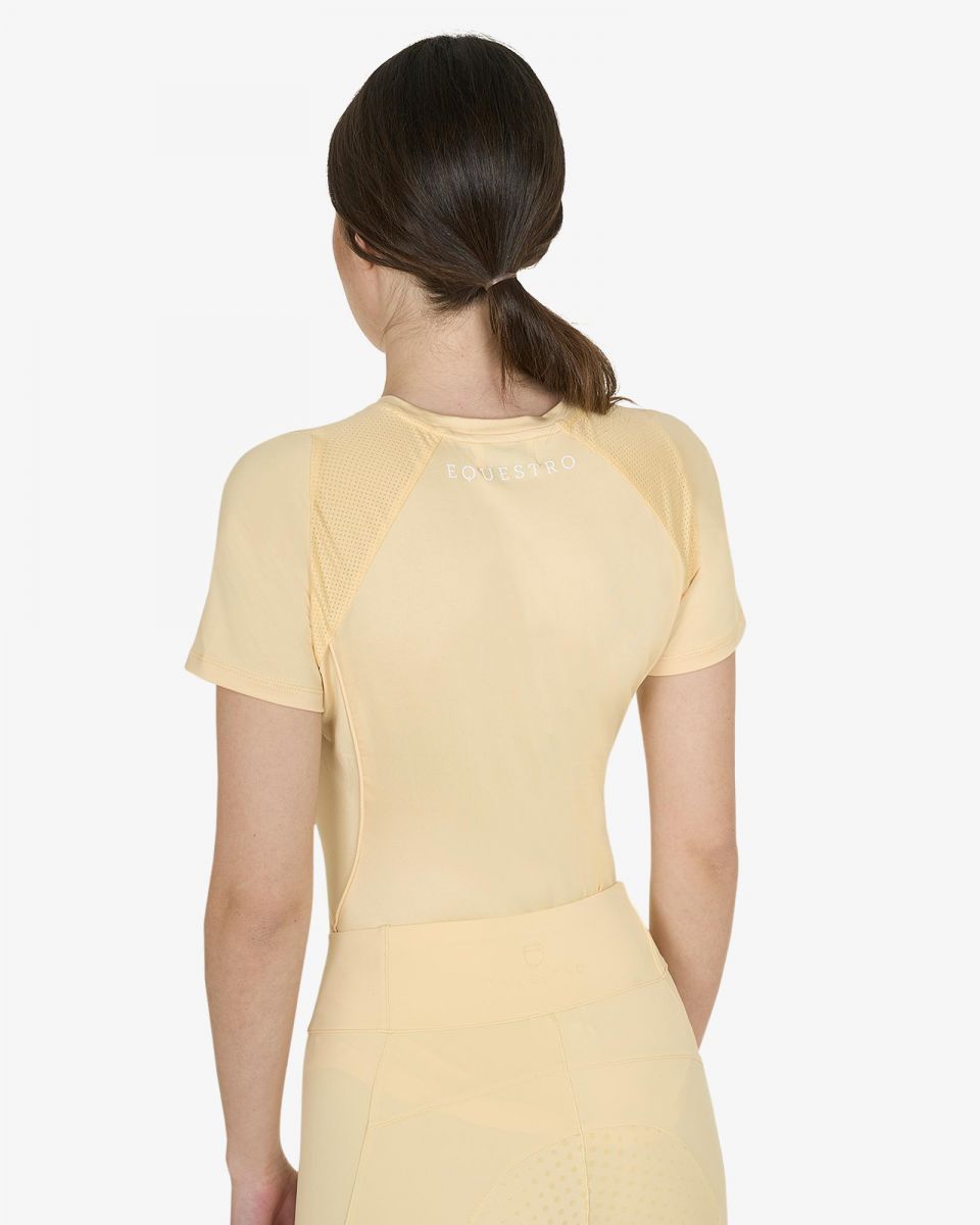 T-shirt donna slim fit, in tessuto tecnico traspirante a mezza manica, è impreziosita con piping, logo del brand e scritta Equestro laterale.